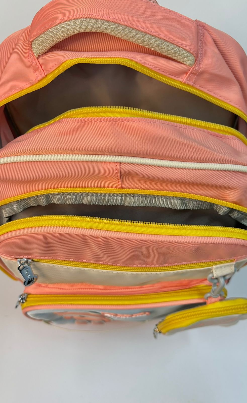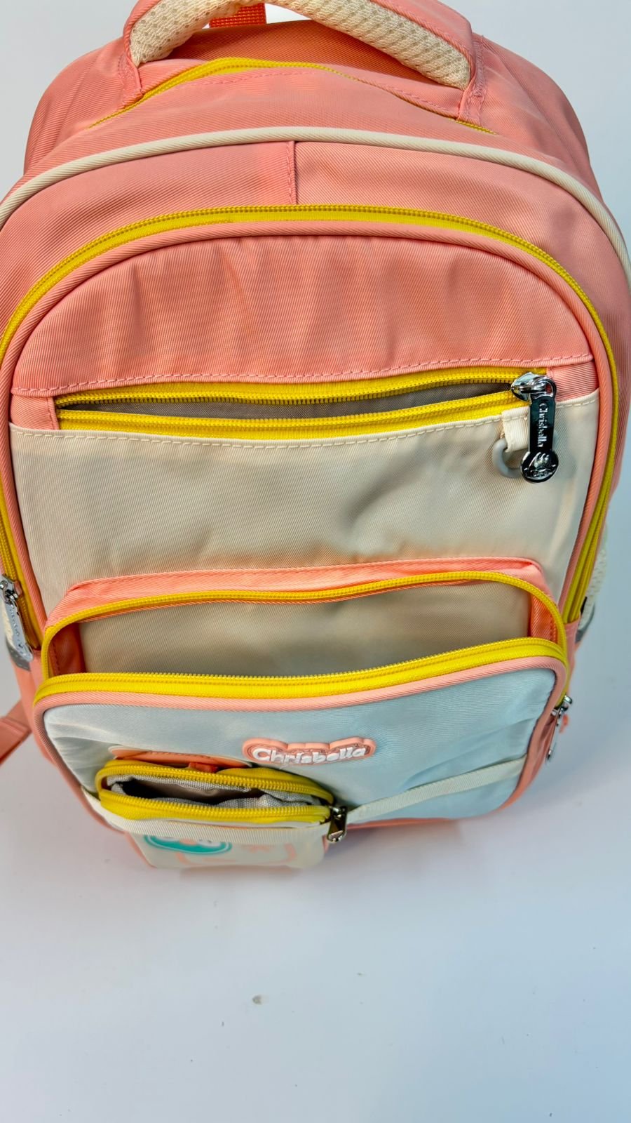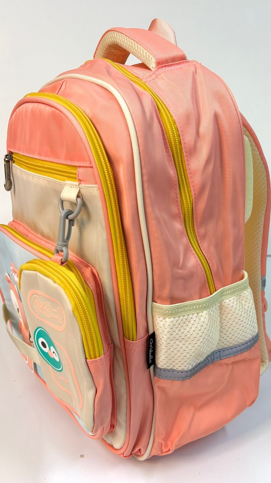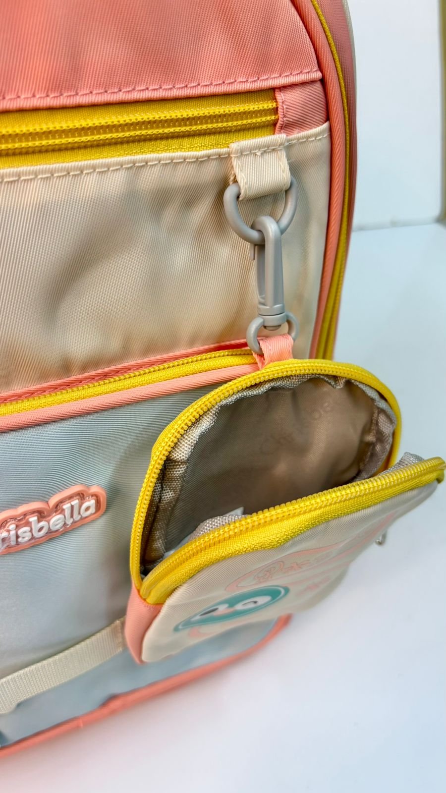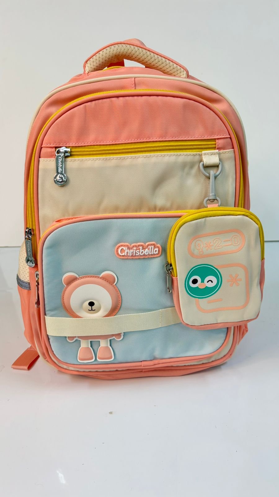 حقيبة بألوان باستيل (برتقالي/أزرق) مع رسمة دب لطيف، محببة للأطفال.