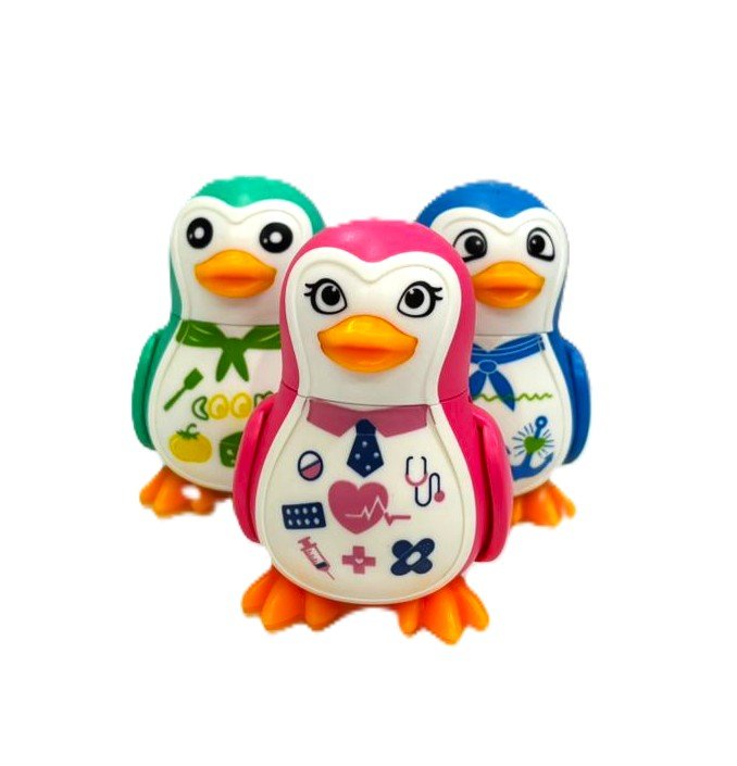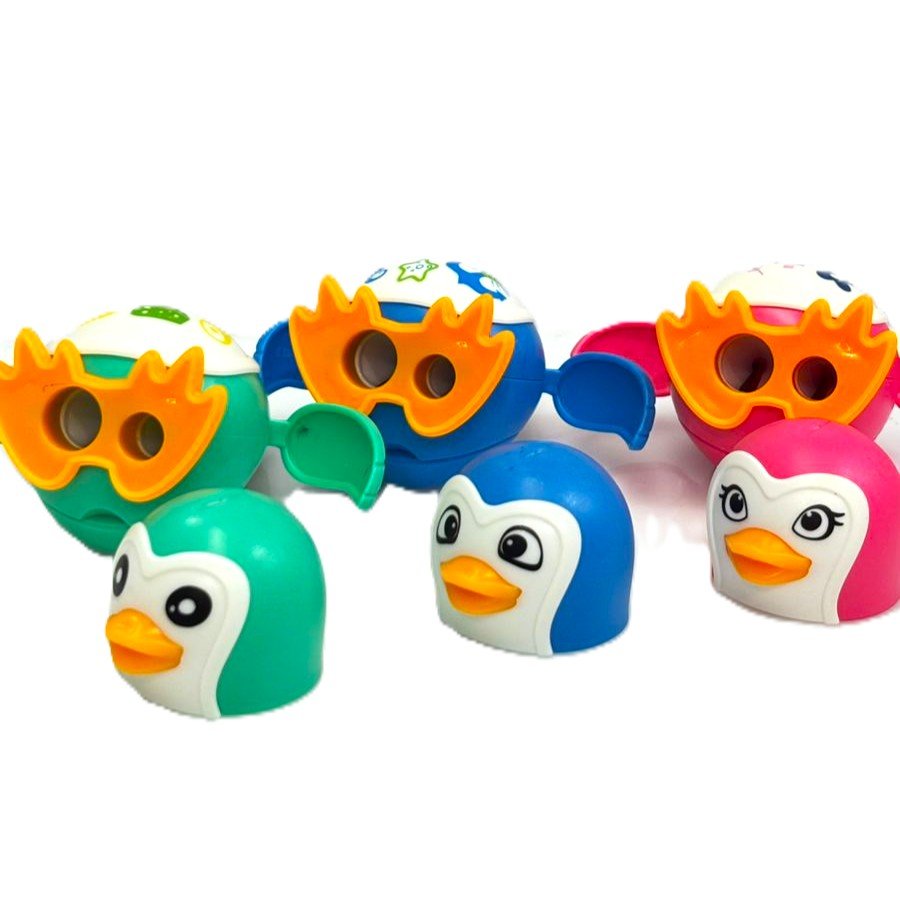اجمع بين الممحاة والمبراة في تصميم واحد لطيف على شكل بطريق، بألوان زاهية ورسومات تعكس شخصيات مختلفة مثل الطباخ، الطبيب، والبحار.