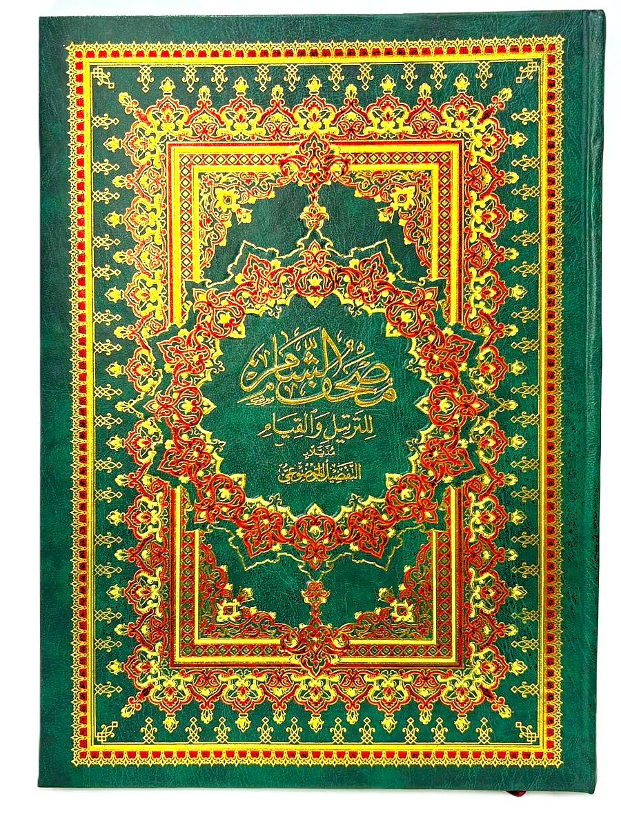 صحف فاخر مخصص لصلاة التهجد والقيام، يأتي بغلاف فني مميز بلون أخضر داكن مزين بزخارف إسلامية ذهبية وحمراء بارزة، تعكس جمال الطباعة وجودة التصميم. يحتوي على صفحات ذات طباعة واضحة تسهّل القراءة أثناء الليل، مع تقسيمات مناسبة للتلاوة في صلاة التهجد.
