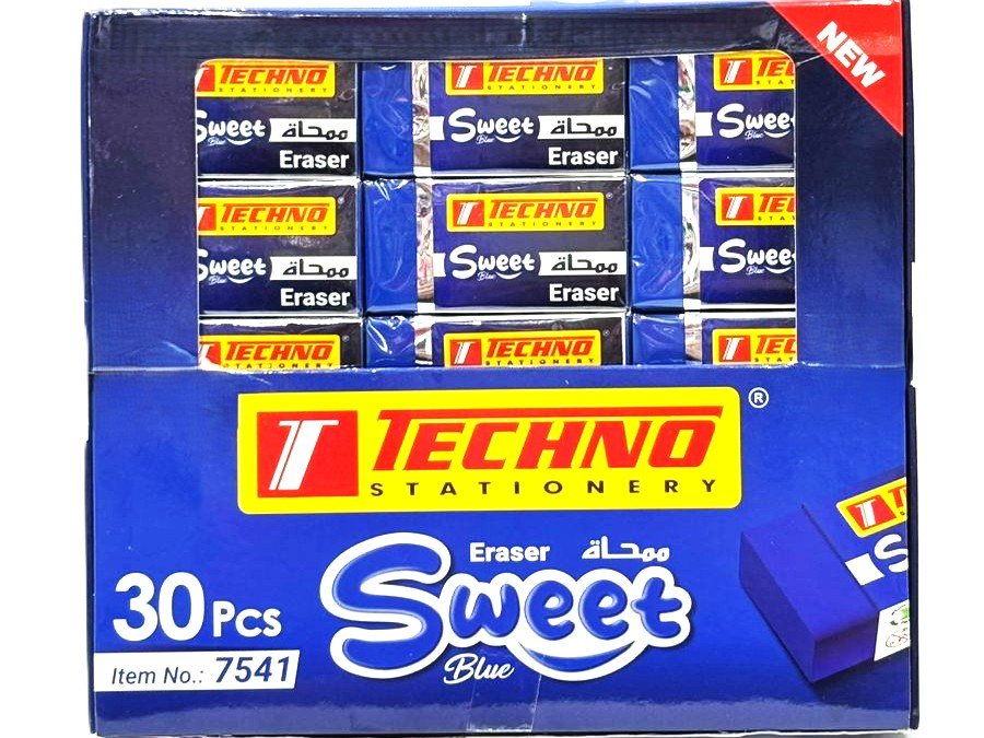 ممحاة صغيرة الحجم بلون أزرق داكن، تأتي مغلفة بغلاف ورقي يحمل شعار Techno Stationery واسم الطراز Sweet Blue باللونين الأبيض والأسود.