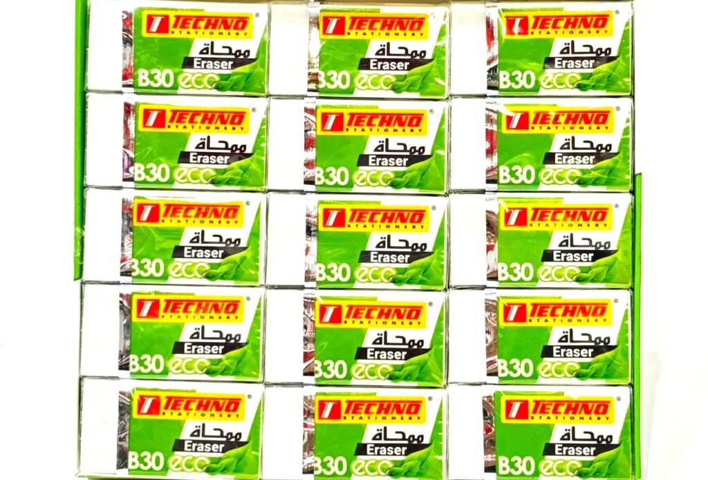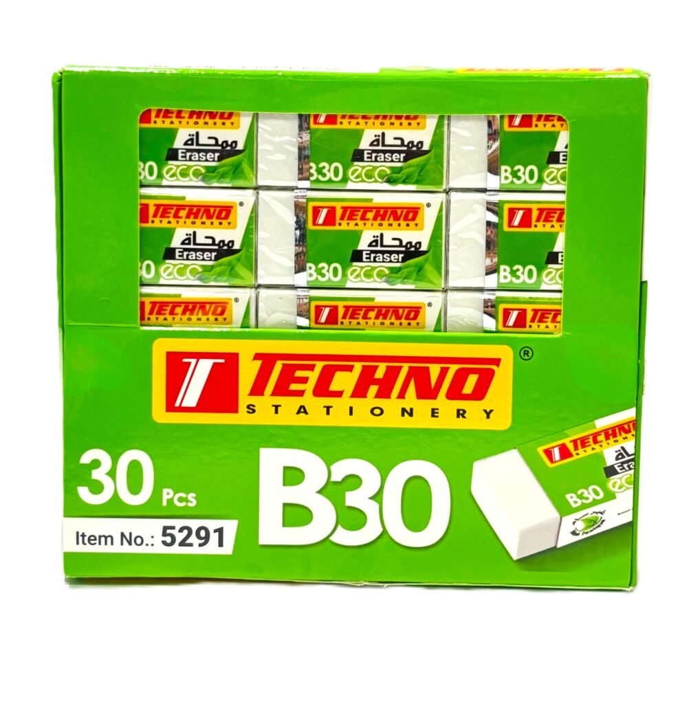 ممحاة B30 من Techno بغطاء ورقي عملي وطابع Eco على العبوة. تمحو أثر قلم الرصاص بسلاسة وتحافظ على نظافة الورق—اختيار مناسب للمدرسة والمكتب. العلبة تحتوي على 30 قطعة، رقم الصنف: 5291.