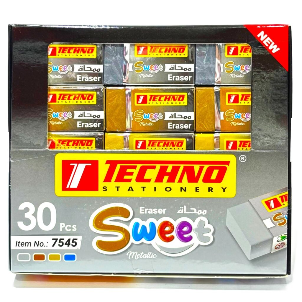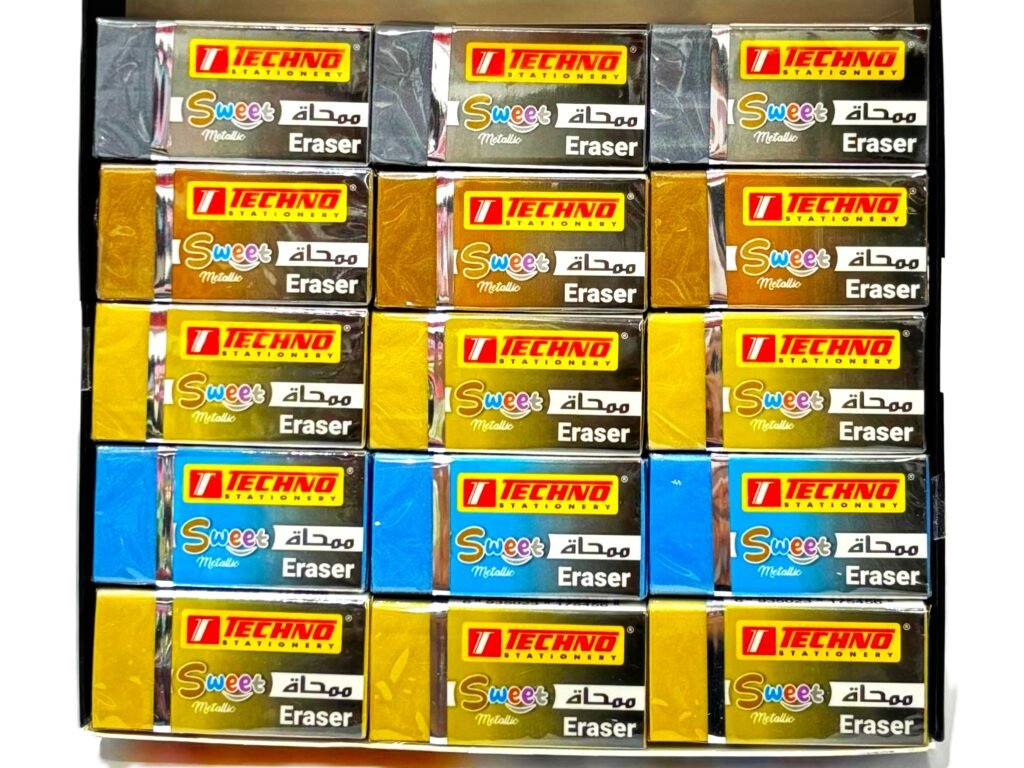 ممحاة بلون باستيل ناعم (بنفسجي، أصفر، أزرق، وردي، وغيرها)، تأتي مغلفة بغلاف أنيق يحمل شعار Techno Stationery واسم الطراز Sweet Pastel بخط عصري وملوّن.